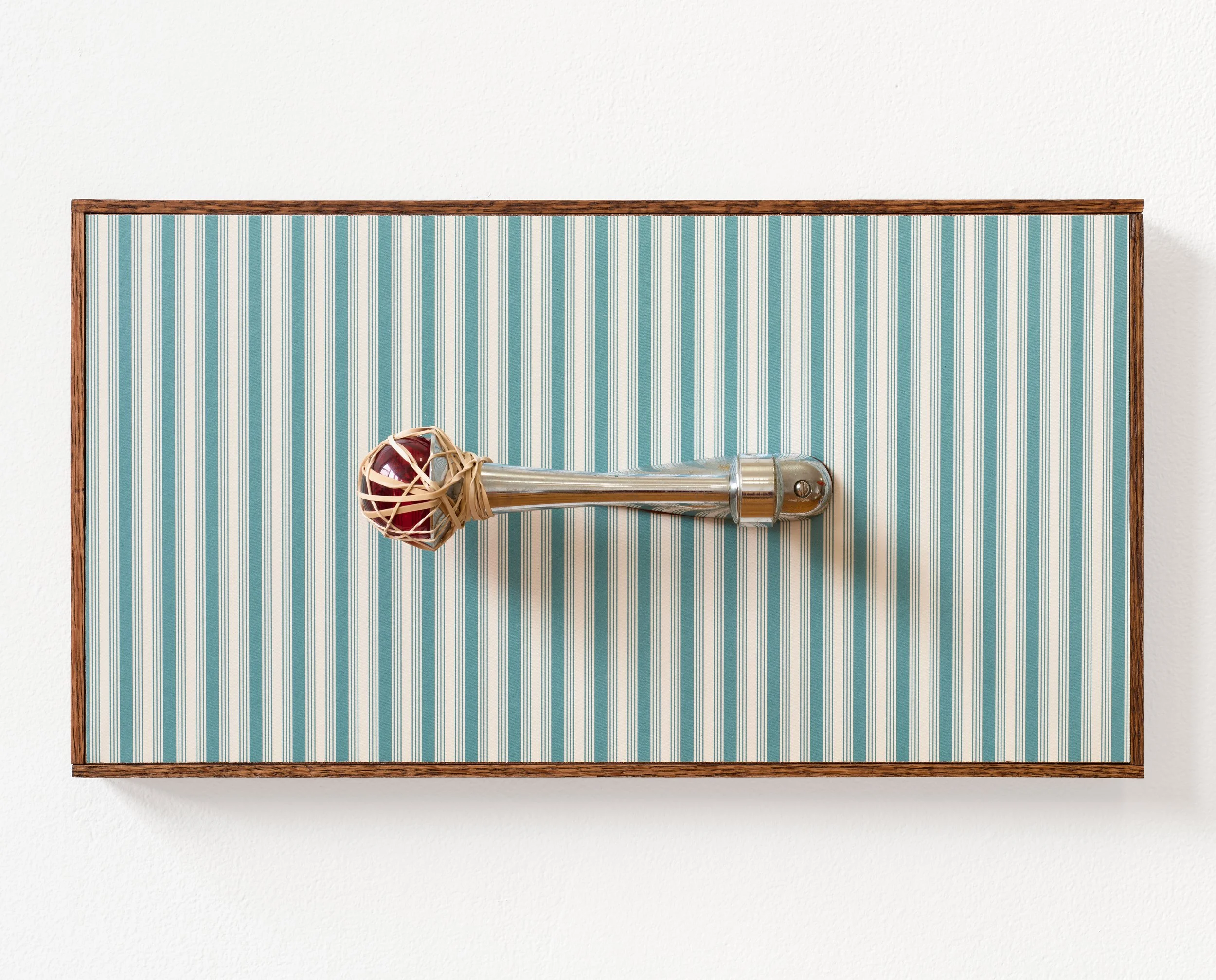 Falcon marine horn, red incandescent light bulb, rubber band, doll house wallpaper, red oak, acrylic, hardware